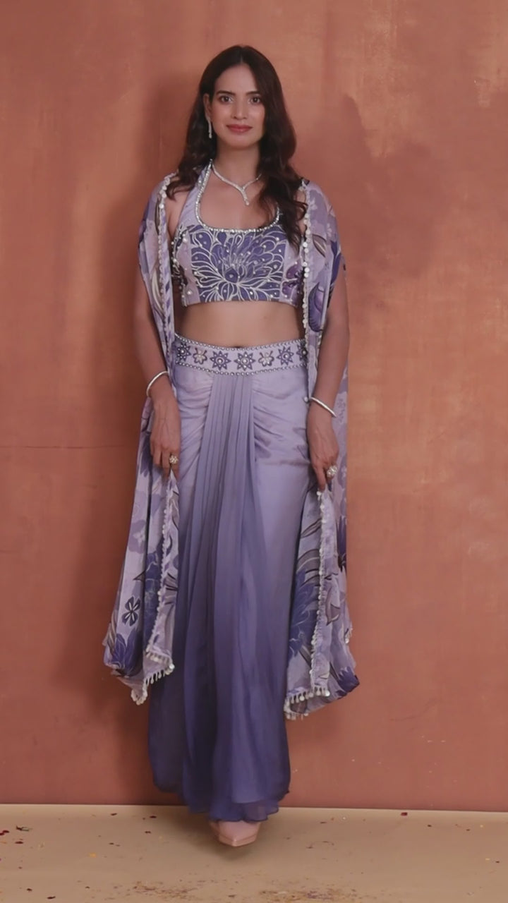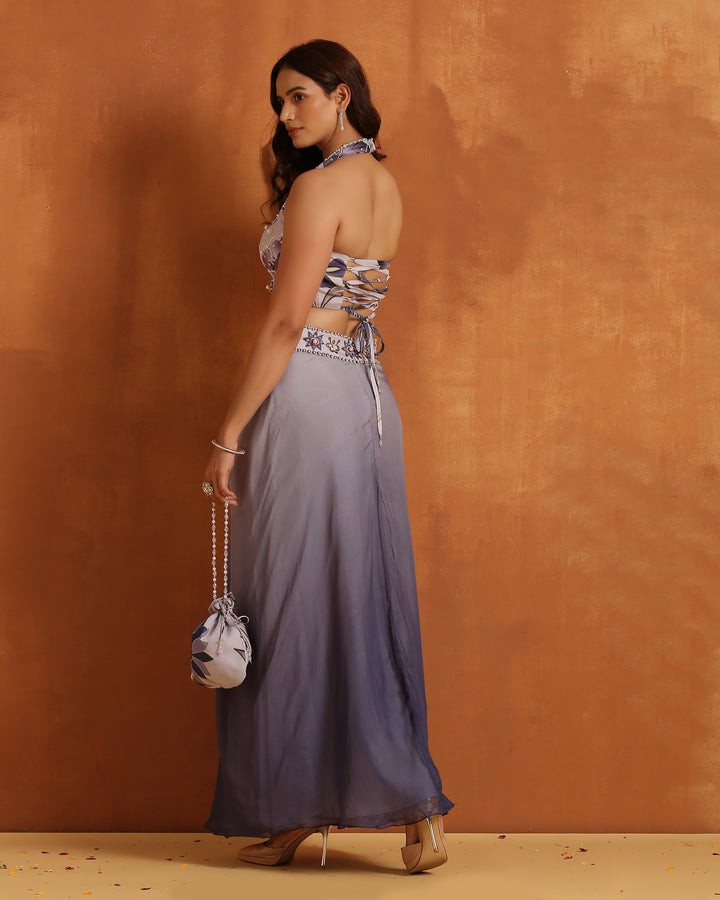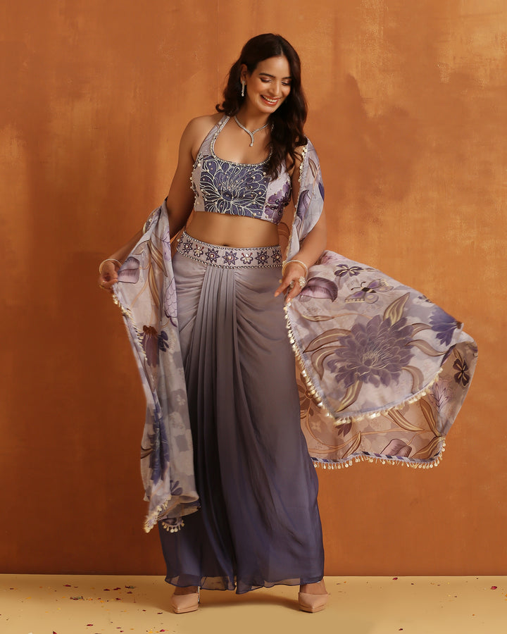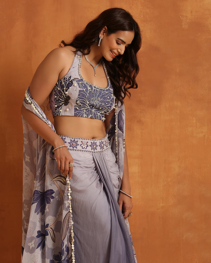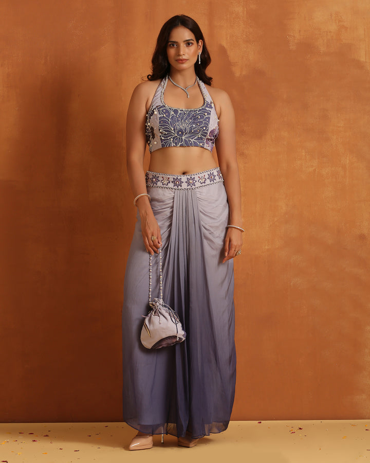 🔹 Blouse: A beautifully fitted, halter-neck crop top adorned with intricate floral prints in subtle shades of grey and lavender. The blouse features delicate pearl detailing and provides a flattering, structured look that complements the flowy elements of the outfit.