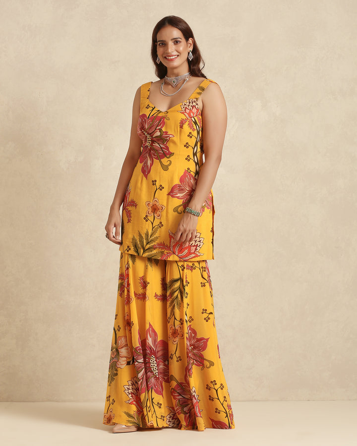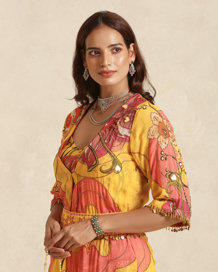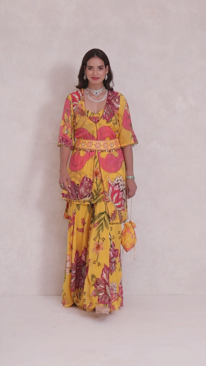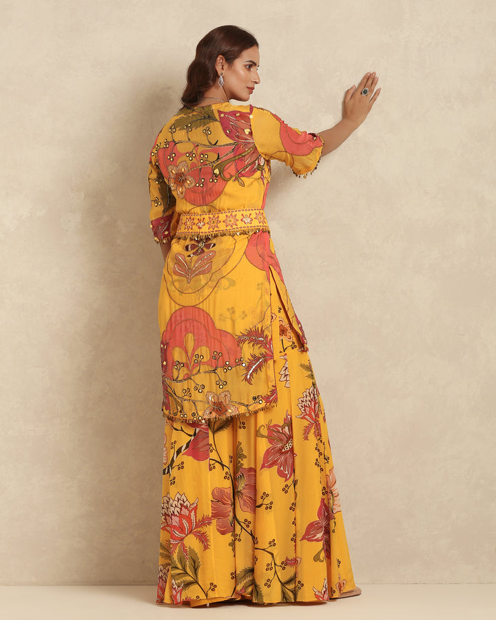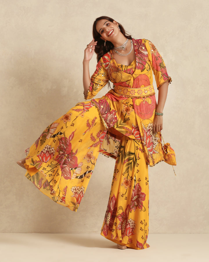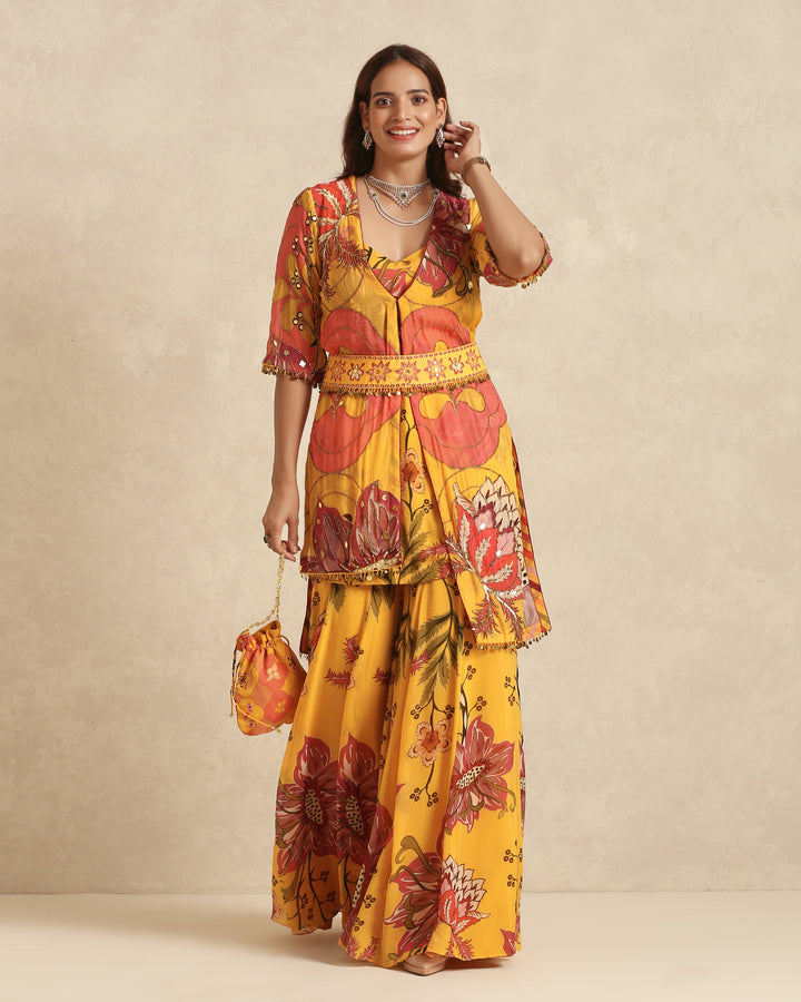 Add a vibrant twist to your festive style with this mustard floral Indo-Western set, blending traditional elegance with modern flair. Turn heads in this set featuring a flowing Kurti, wide-leg pants, embroidered belt, and a matching potli bag. Ideal for weddings, mehendi, and festive occasions.