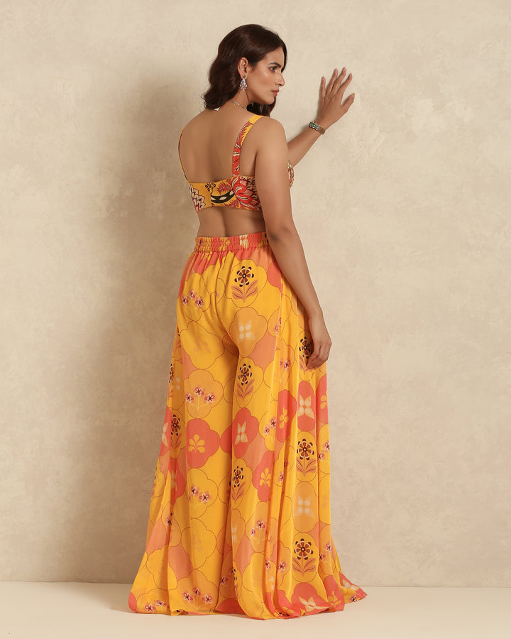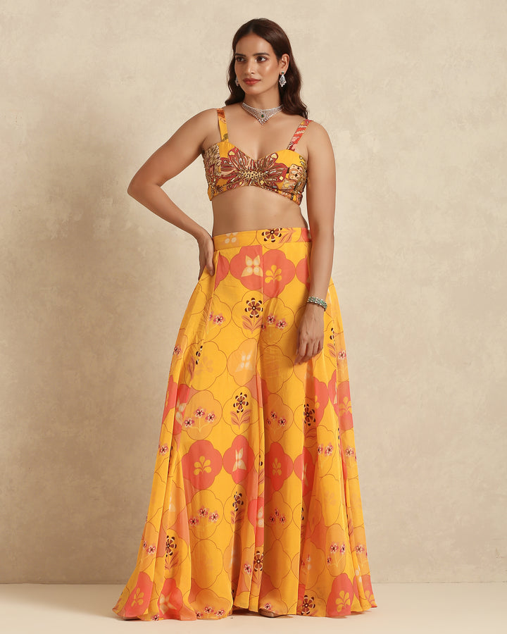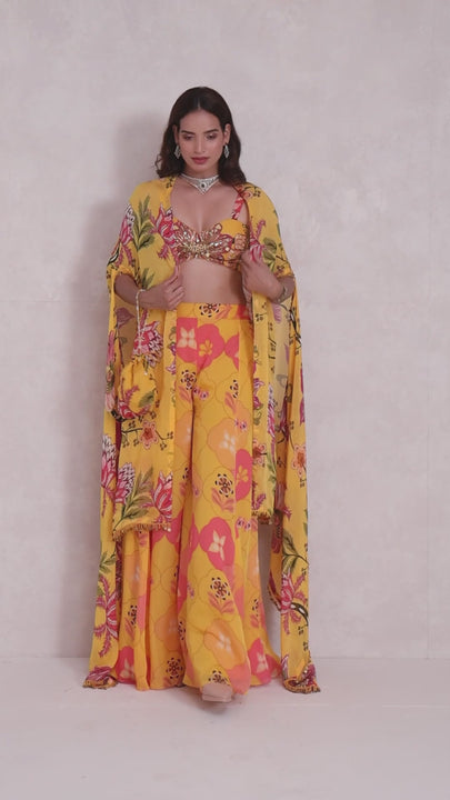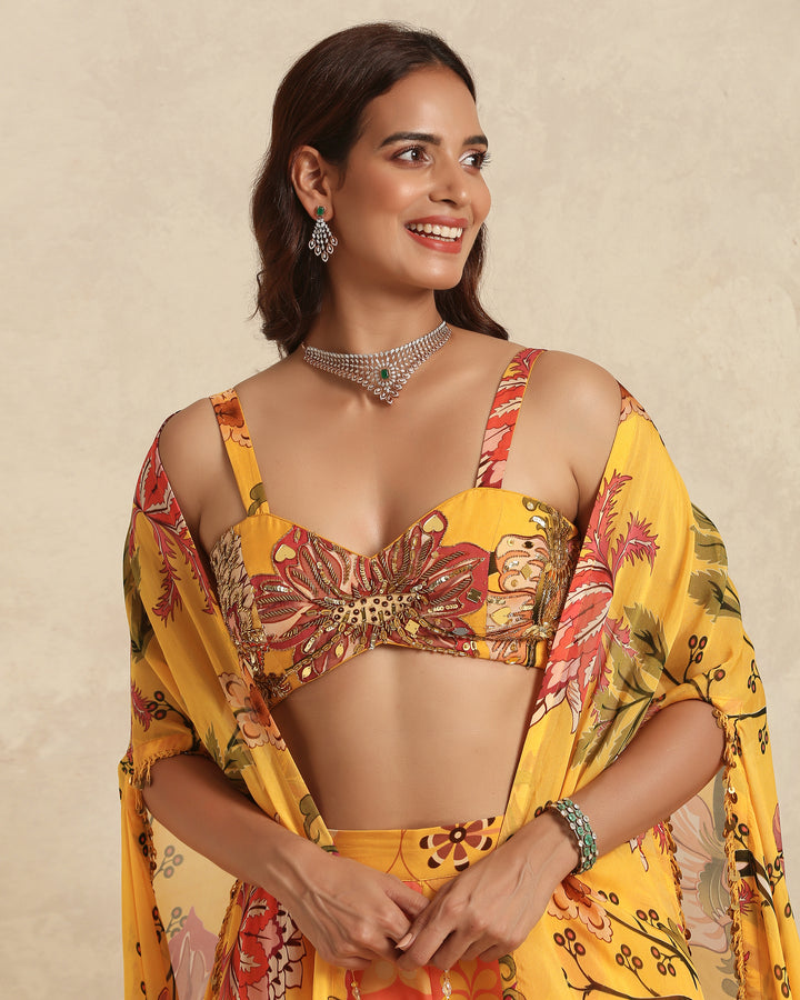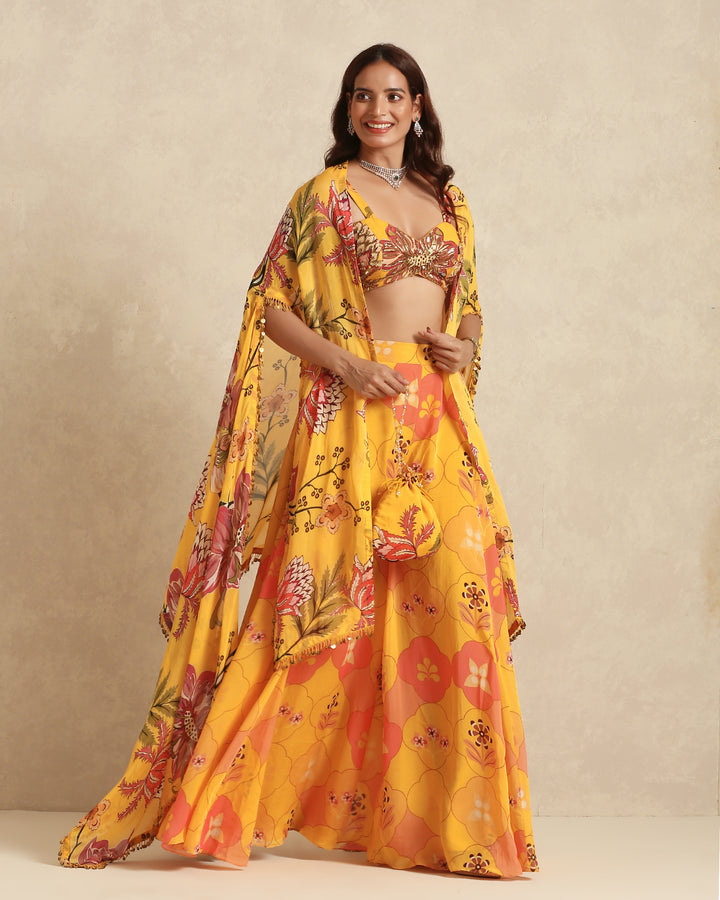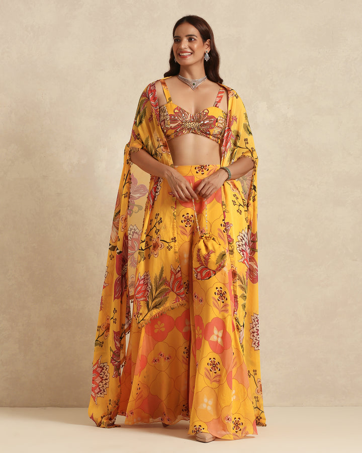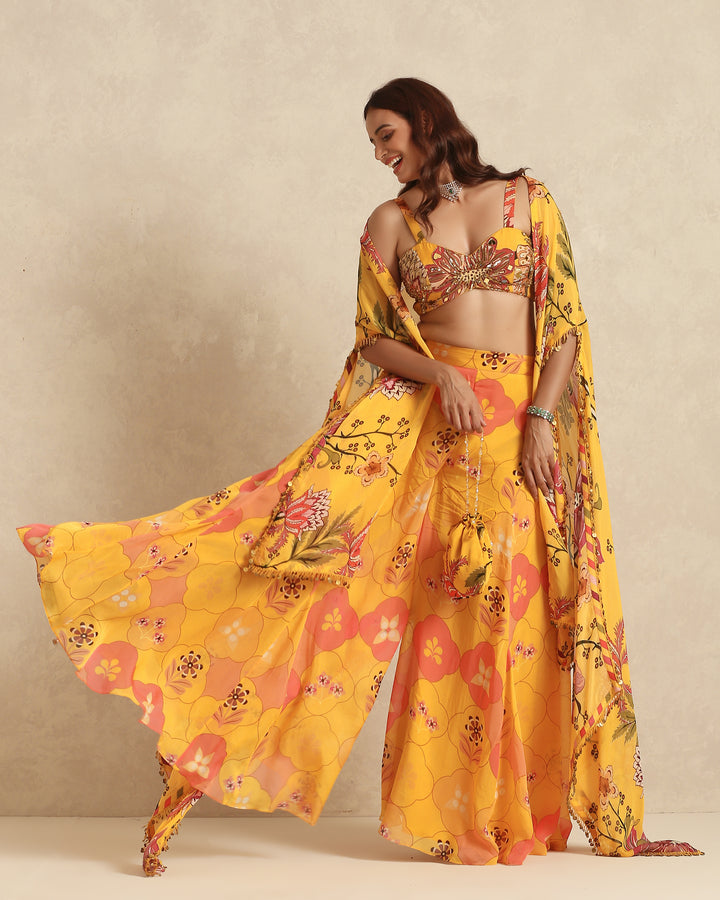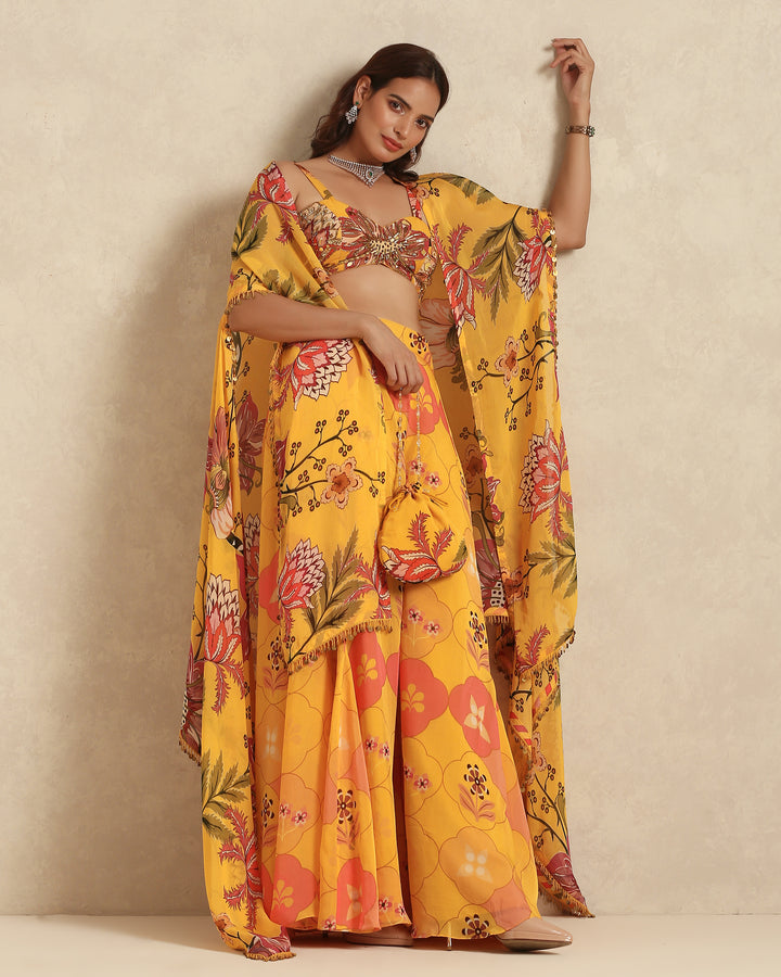 Step into effortless style with this mustard floral Indo-Western set featuring an embroidered bustier, flowy pants, and a statement cape. Perfect for weddings, festive occasions, and modern celebrations. A vibrant fusion of contemporary design and festive charm.